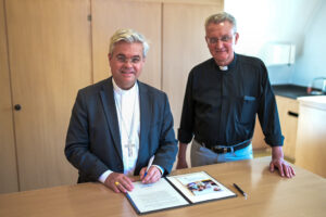 Gemeinsam mit dem Leiter des Bereichs Schule und Hochschule, Dompropst Monsignore Joachim Göbel, unterzeichnete Erzbischof Dr. Udo Markus Bentz das neue Leitbild und überreichte es den Schulleiterinnen und Schulleitern der versammelten Schulen beim Tag des Schulpersonals Ende August in Paderborn.